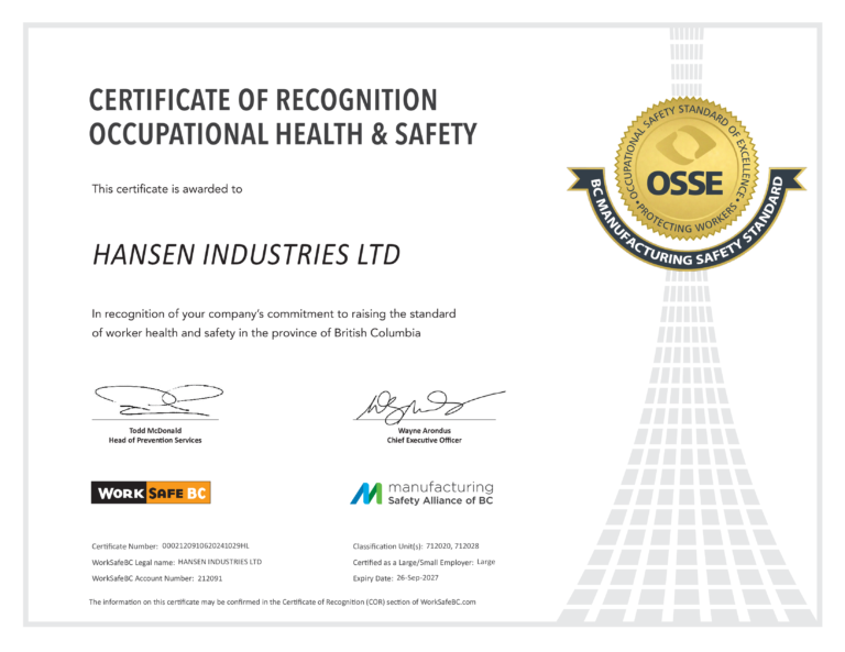 Hansen Industries Ltd. is honoured to have been certified to a high